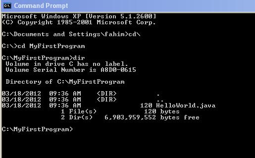 برای اینکه مطمئن شویم در محل درست قرار داریم ، از دستور dir استفاده می کنیم. همانطور که می بینید ، فایل HelloWorld.java در مسیر جاری قرار دارد . ابتدا برای کامپایل کردن برنامه ای که نوشتیم دستور زیر را اجرا می کنیم :